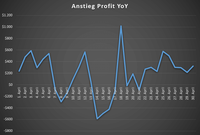 In der folgenden Grafik sieht man den Anstieg oder besser gesagt die Veränderung des Profits im Jahresvergleich. Wir hatten einige Tage an denen wir über 500$ weniger verdient haben als noch vor einem Jahr. Bitter.